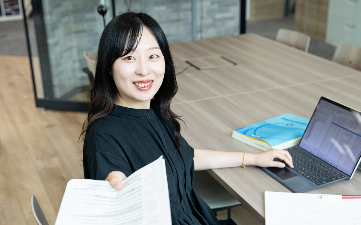 私の所属する医薬品課には、それぞれ異なる強みを持った方が多く在籍しています。中国や日本の医薬品メーカーで長年経験を積んだ方、研究開発に精通した博士、薬事分野に深い知見を持つ薬剤師の方など、日々の業務で不明点があったり判断に迷ったりする場面でも、すぐに相談できる環境があり、とても心強いです。分からないことがあって質問すると、質問したことの回答はもちろん、それ以外の注意点や参考になる文献まで教えてくれるので、すごく勉強になります。実務を通して学びながら成長できるのは、こうした先輩方の存在とサポートのおかげだと日々感じています。